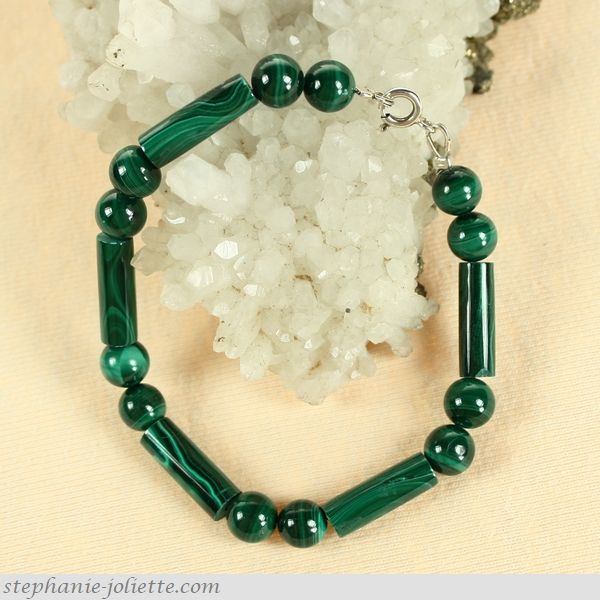 MALA039-078BSI / Armband (auf Edelstahldraht), Steine/Schliff (Malachit-Kugeln 8 mm, Malachit-Zylinder 18x6 mm), Verschluss (Federring aus 925er Sterlingsilber), Länge (21 cm) / 39.- €uro